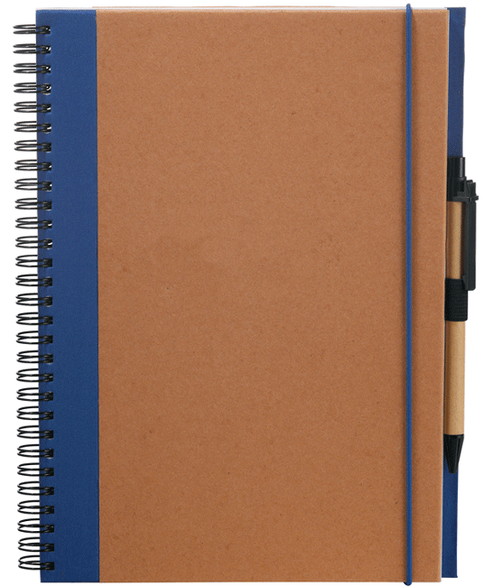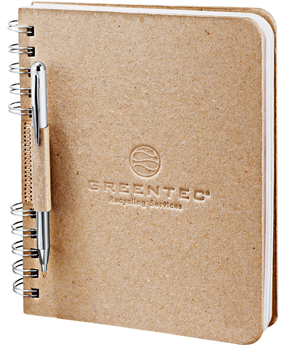 Features : Eco recycled journal with pen combo. Ballpoint pen is made out of recycled paper and corn starch. Notebook is made out of cardboard with double spiral binding, elastic pen loop on cover and 80 white lined sheets. 70% recycled hard cover and 50% recycled interior.